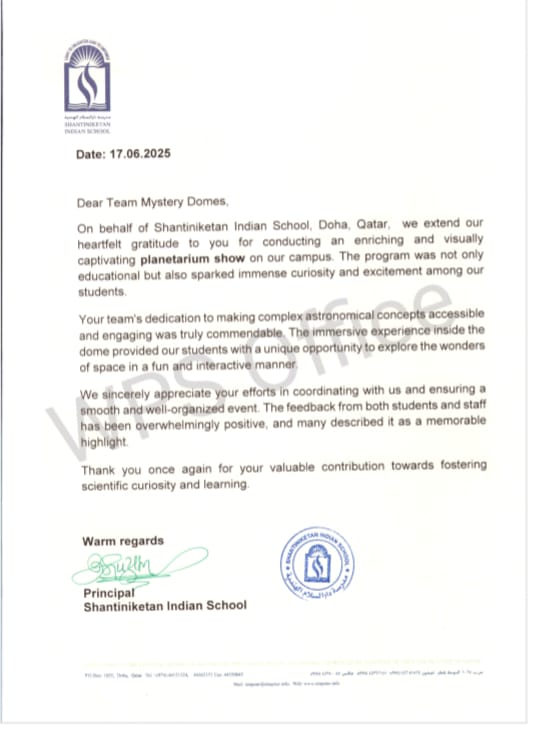 On behalf of Shantiniketan Indian School, Doha, Qatar, we extend our heartfelt gratitude to you for conducting an enriching and visually captivating planetarium show on our campus. The program was not only educational but also sparked immense curiosity and excitement among our students.